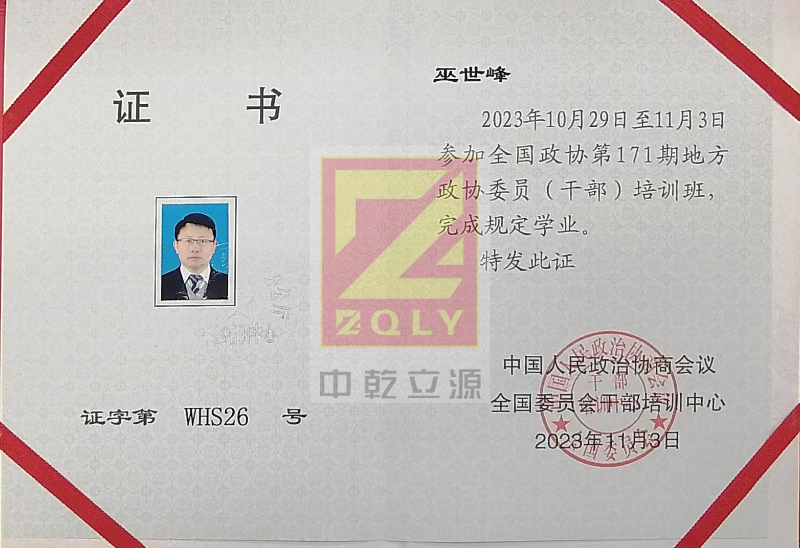 【2023】董事長巫世峰全國政協(xié)委員培訓(xùn)結(jié)業(yè)證書
