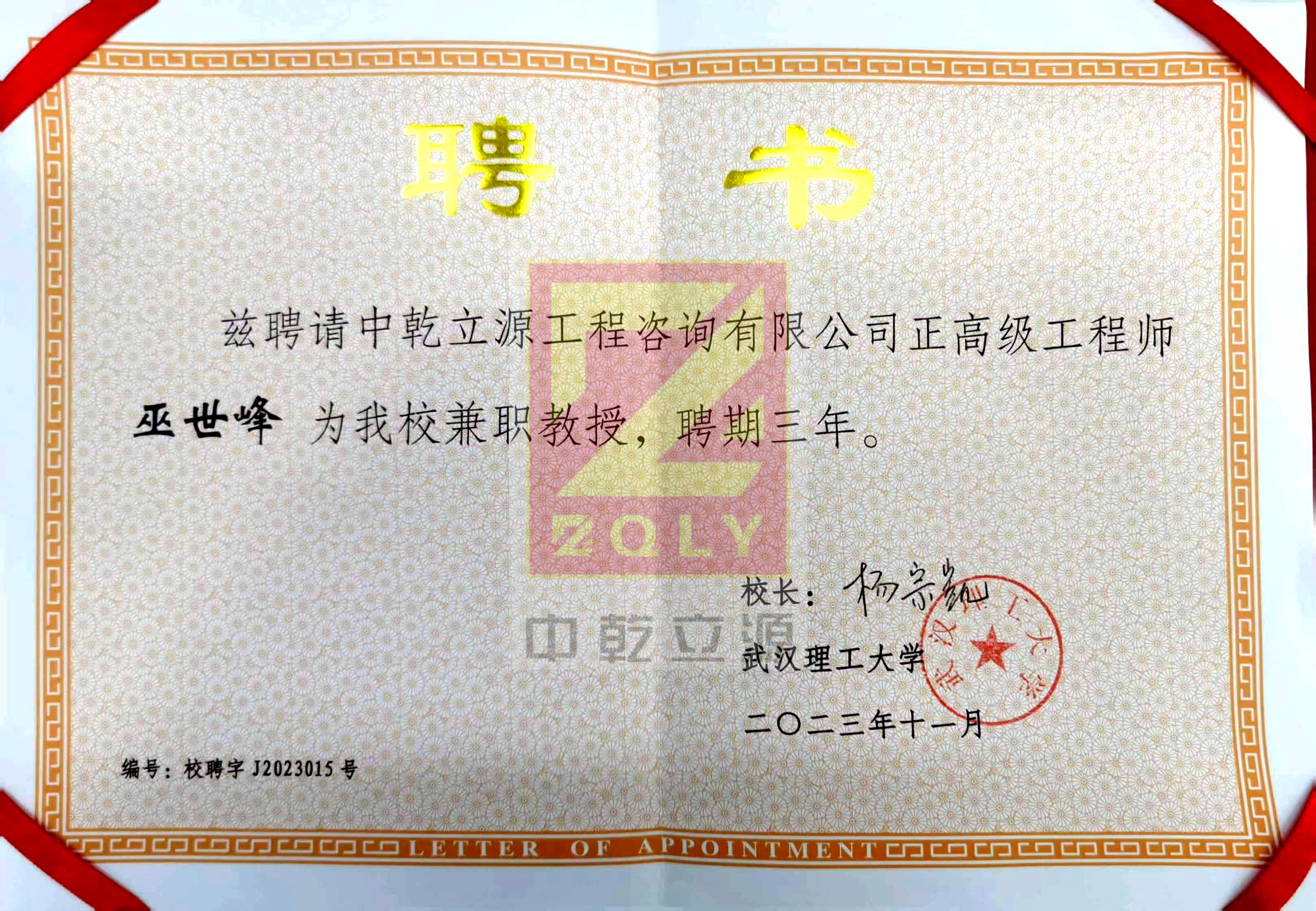 【2023】董事長巫世峰獲聘武漢理工大學(xué)兼職教授