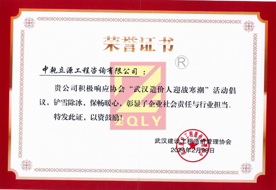 【2024】中乾立源榮獲“武漢造價人迎戰(zhàn)寒潮”榮譽(yù)證書