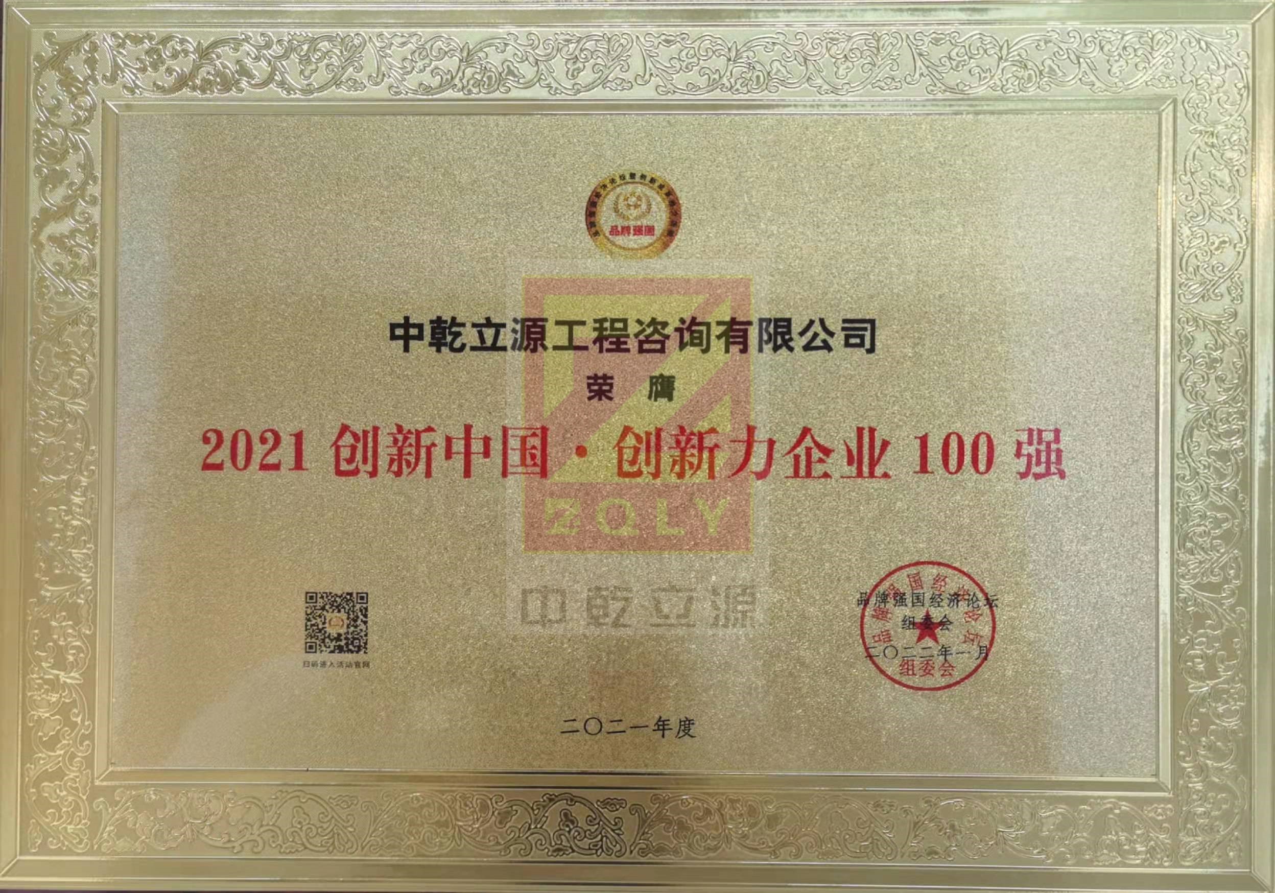【2022】2021創(chuàng)新中國-創(chuàng)新力企業(yè)100強證書
