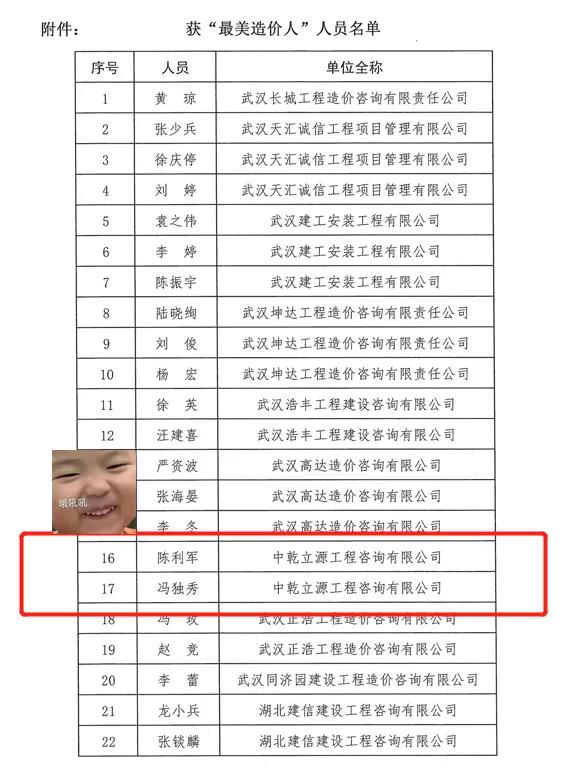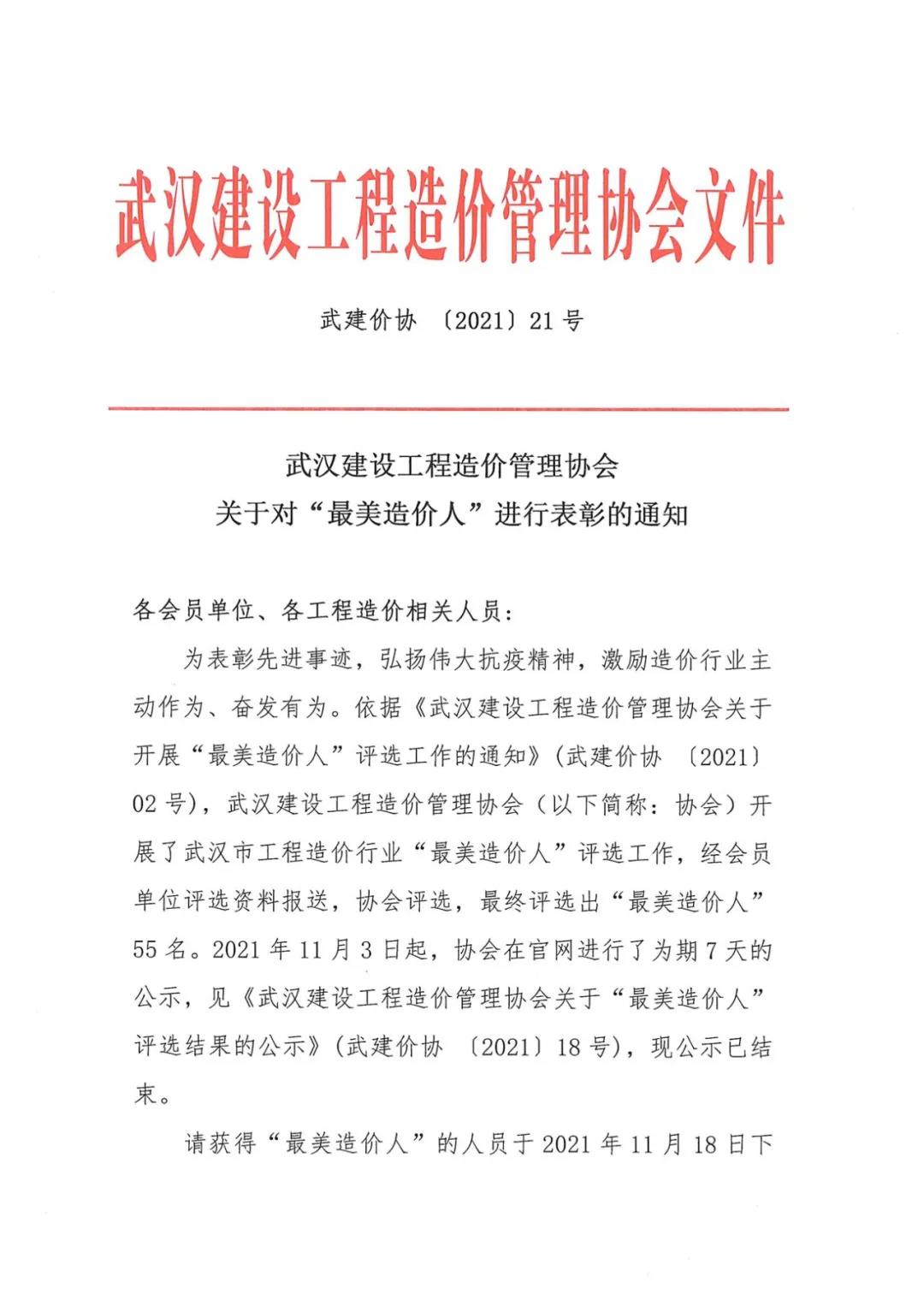 近日,由武漢建設(shè)工程造價管理協(xié)會組織開展的造價行業(yè)“最美造價人”評選結(jié)果揭曉,武漢市共計評出55名2021年度最美造價人,其中我司馮獨秀和陳利軍同時獲評。