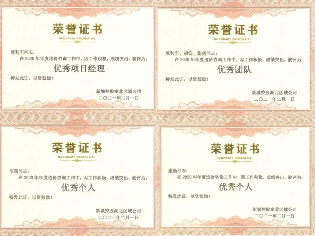 2月1日,新城控股授予我司“2020年度優(yōu)秀團(tuán)隊(duì)”、我司員工“2020年度優(yōu)秀項(xiàng)目經(jīng)理”、“2020年度優(yōu)秀個(gè)人”等榮譽(yù)稱(chēng)號(hào)!