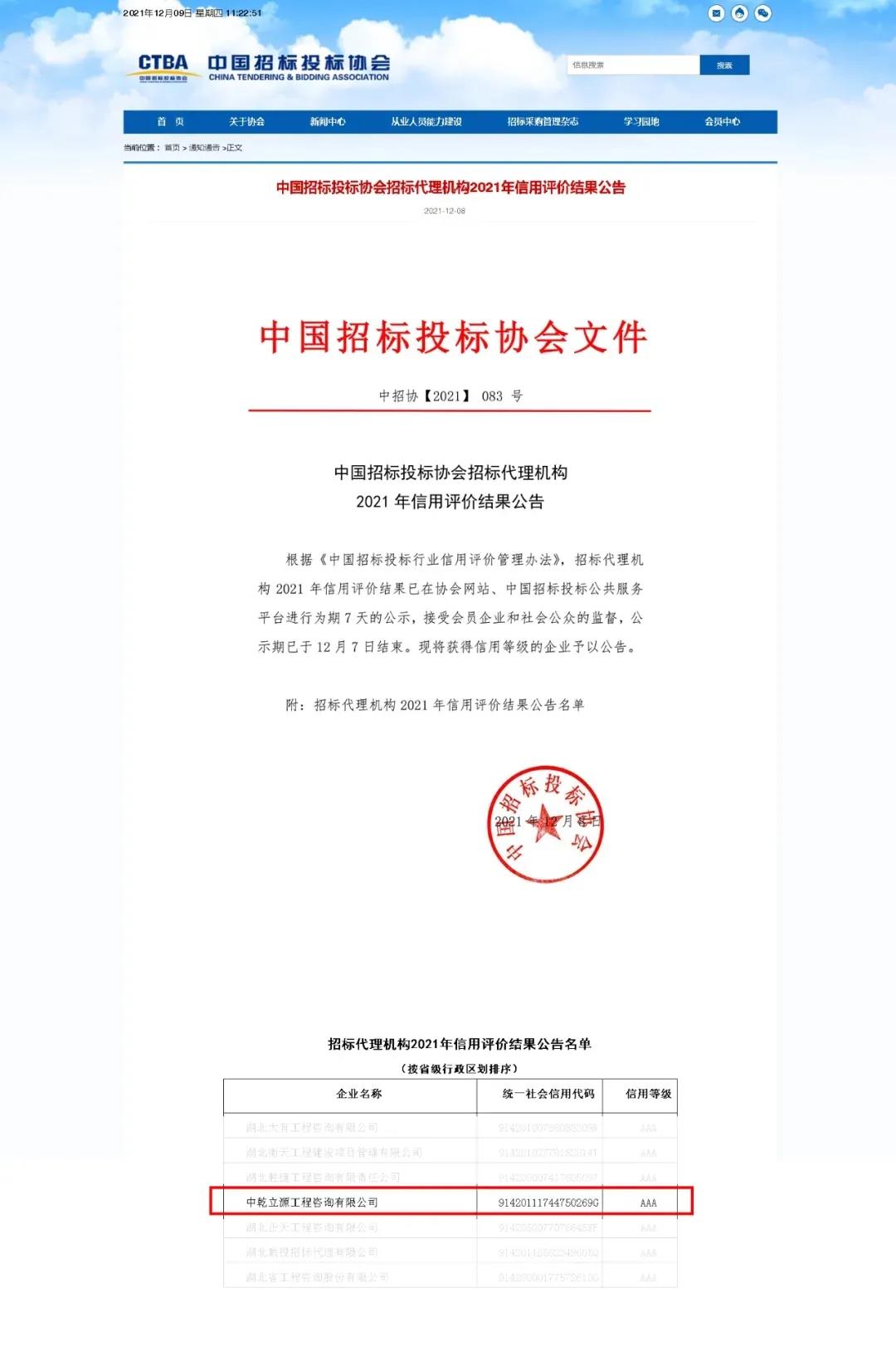 12月8日,中國(guó)招標(biāo)投標(biāo)協(xié)會(huì)公示《招標(biāo)代理機(jī)構(gòu)2021年信用評(píng)價(jià)結(jié)果》,中乾立源2021年度繼榮獲“工程造價(jià)AAA企業(yè)”稱(chēng)號(hào)之后,在招標(biāo)代理行業(yè)再次獲評(píng)最高信用等級(jí)——AAA。