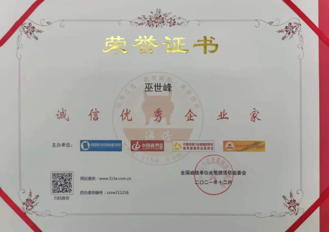 董事長(zhǎng)巫世峰榮獲誠(chéng)信優(yōu)秀企業(yè)家榮譽(yù)
