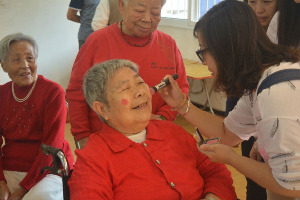 剛到康樂園,和藹可親的老人們就在園區(qū)大門處迎接我們的到來。員工代表女生組張曉梅、陳琦、張瑾為老人們化妝,打扮,一直忙個不停,年輕小伙子忙著到二樓、各個房間攙扶老人,李丹、石天軍忙著陪老人聊天,此時此刻,我們感受到大家的熱情,這一份份的情都代表著他們的一顆愛心,慰問始終洋溢著歡樂、祥和的氣氛。