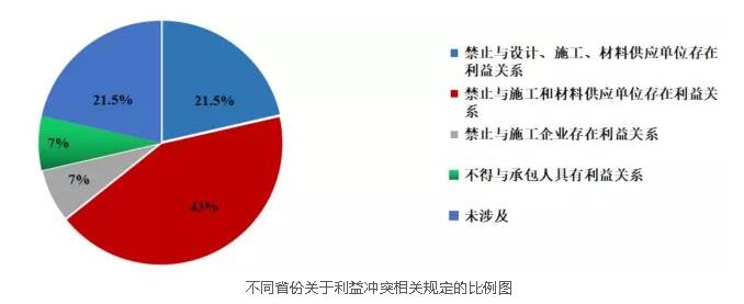當(dāng)前全過程工程咨詢的業(yè)務(wù)范圍均不包含施工和材料設(shè)備供應(yīng),因此承接全過程工程咨詢業(yè)務(wù)的企業(yè)一般不能承擔(dān)同一項目的施工和材料設(shè)備供應(yīng)業(yè)務(wù),同時部分省份還規(guī)定不得與施工企業(yè)、材料設(shè)備供應(yīng)企業(yè)存在利益關(guān)系,不同省份規(guī)定的比例參見圖: