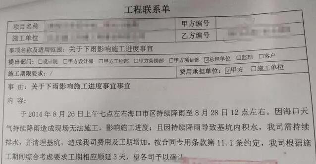 工程聯(lián)系單通常都是使用在不會產(chǎn)生工程費用或直接產(chǎn)生嚴重后果的場合。比如通知承包人來開會,或者通知停水停電,提醒注意節(jié)假日的工作安排等等。有時工程聯(lián)系單也會通知產(chǎn)生費用的項目,比如上級領導要來視察,通知承建商“清水灑街”,這顯然要產(chǎn)生費用,但這個時候工程聯(lián)系單仍僅產(chǎn)生“通知”效用。費用的確認與獲得,必須走“工程簽證”才會被確認。沒有走后面的流程,視為承包人沒有費用要求,不論事實是不是產(chǎn)生了費用。所以常規(guī)理解工程聯(lián)系單都是不產(chǎn)生費用的日常事項。如果產(chǎn)生了費用或其他聯(lián)帶事項,就會激活“工程簽證”等相關流程。