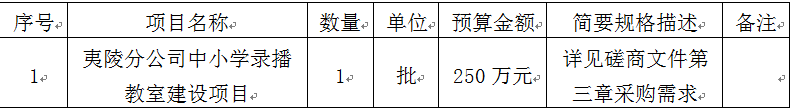 1 夷陵分公司中小學(xué)錄播教室建設(shè)項(xiàng)目 1 批 250萬元 詳見磋商文件第三章采購需求