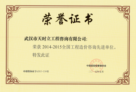 2015年5月,中國招投標(biāo)管理協(xié)會授予我公司“2014-2015全國工程造價咨詢先進(jìn)單位”。這充分體現(xiàn)了我公司在工程造價領(lǐng)域服務(wù)獲得的社會各界和行業(yè)的認(rèn)可和好評,也是對公司全體員工付出努力的肯定。在此,表示熱烈祝賀!