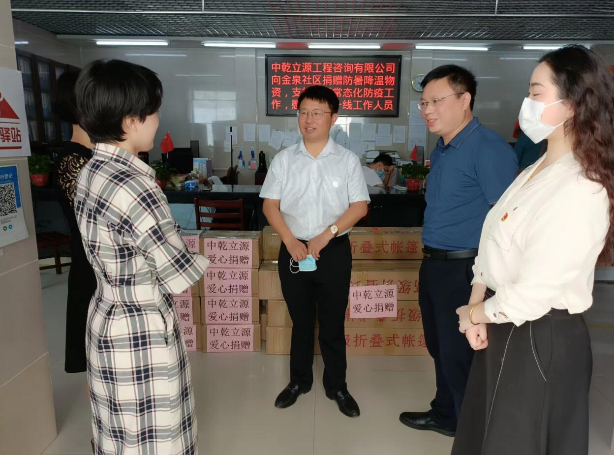 “從疫情發(fā)生到現(xiàn)在,兩年多了,不論是嚴寒還是酷暑,你們始終都堅守在抗疫一線,保障轄區(qū)居民的生命健康安全?,F(xiàn)在天氣炎熱,我們企業(yè)送些帳篷和防暑降溫物資,希望在夏日能給你們社區(qū)工作人員遮陽避雨,送去一份清涼?!?月17日上午,在市委統(tǒng)戰(zhàn)部相關(guān)負責人帶領(lǐng)下,武漢市政協(xié)委員、洪山區(qū)政協(xié)委員,民建會員,武漢建設(shè)工程造價管理協(xié)會會長,董事長巫世峰,黨支部書記黃婧晗,辦公室主任閔芳一行人到卓刀泉街道金泉社區(qū)捐贈帳篷和防暑降溫物資,慰問社區(qū)基層一線工作人員。