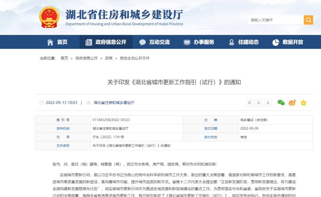 2022年9月13日,湖北省住房和城鄉(xiāng)建設(shè)廳印發(fā)《湖北省城市更新工作指引(試行)》的通知(廳頭〔2022〕1741號),標(biāo)志著《湖北省城市更新工作指引》正式進入試行階段。湖北省城市更新工作由湖北省住房和城鄉(xiāng)建設(shè)廳組織、省規(guī)劃總院牽頭負(fù)責(zé),對全省全面開展和加速推進城市更新具有重要意義。