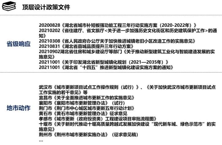 當(dāng)前,省級相關(guān)政策文件中響應(yīng)了國家關(guān)于城市更新的要求,但缺乏針對湖北省情的城市更新專項工作的系統(tǒng)性指引,地級市針對轄區(qū)城市更新工作開展探索和機制建設(shè),相關(guān)政策文件在制定或征求意見當(dāng)中,但尚未形成覆蓋全域的工作體系,尤其是縣級。