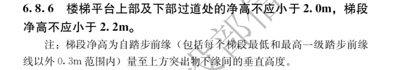 6.8.6 樓梯平臺(tái)上部及下部過道處的凈高不應(yīng)小于2.0m,梯段凈高不應(yīng)小于2. 2m。