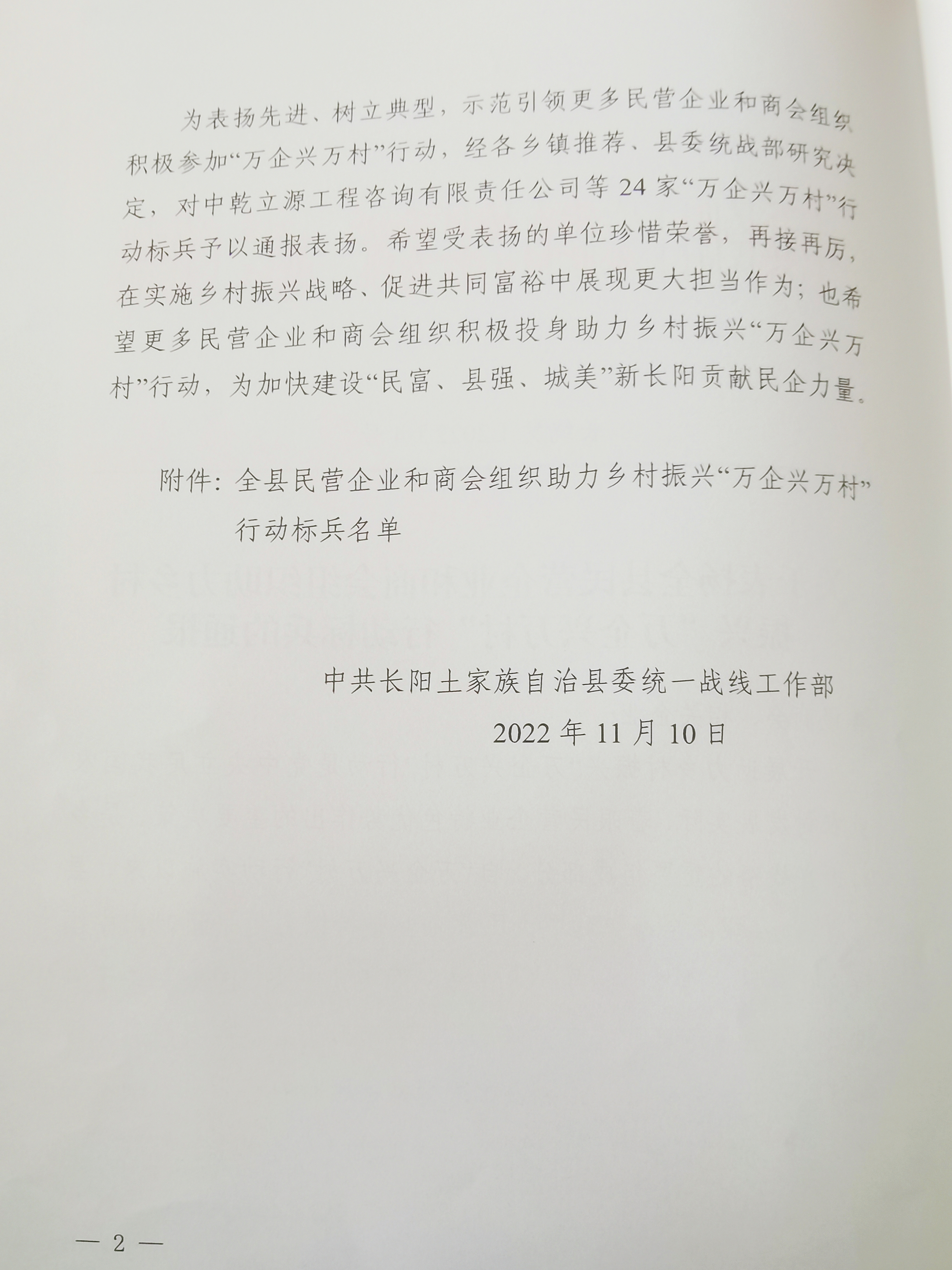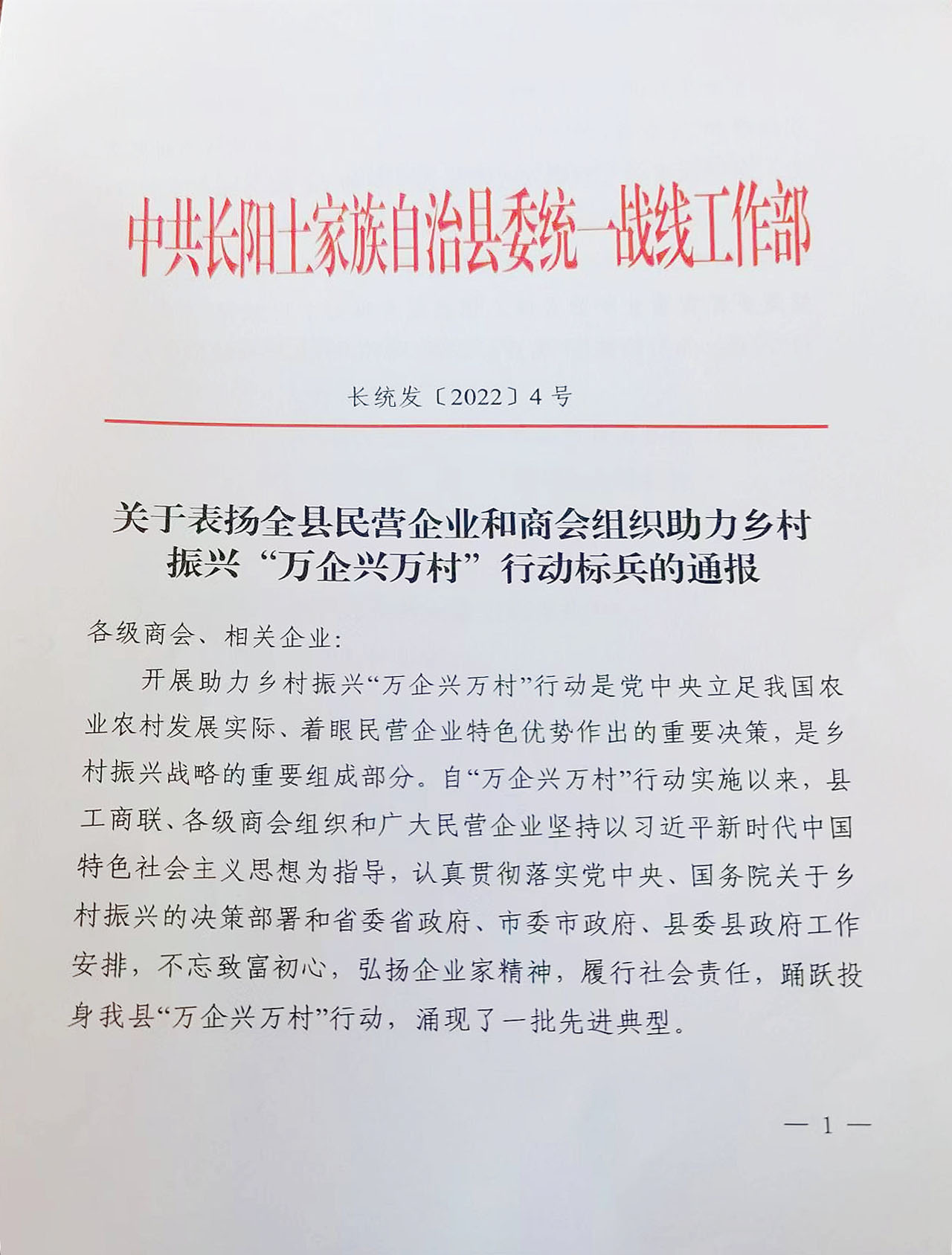 近日,中乾立源榮獲長陽縣民營企業(yè)和商會組織助力鄉(xiāng)村振興“萬企興萬村”行動標(biāo)兵的榮譽稱號。這既是對中乾立源的肯定和認(rèn)可,也是對中乾立源勇于承擔(dān)社會責(zé)任、真誠回報社會的鼓勵和鞭策。