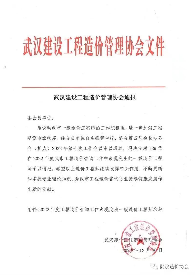 為調(diào)動(dòng)我市一級(jí)造價(jià)工程師的工作積極性,進(jìn)一步加強(qiáng)工程建設(shè)市場(chǎng)秩序,2022年12月20日,武漢市建設(shè)工程造價(jià)管理協(xié)會(huì)對(duì)全市189位在2022年度工作表現(xiàn)突出的一級(jí)造價(jià)工程師予以通報(bào)表揚(yáng),我司優(yōu)秀造價(jià)師吳翾,王紅薇榜上有名。