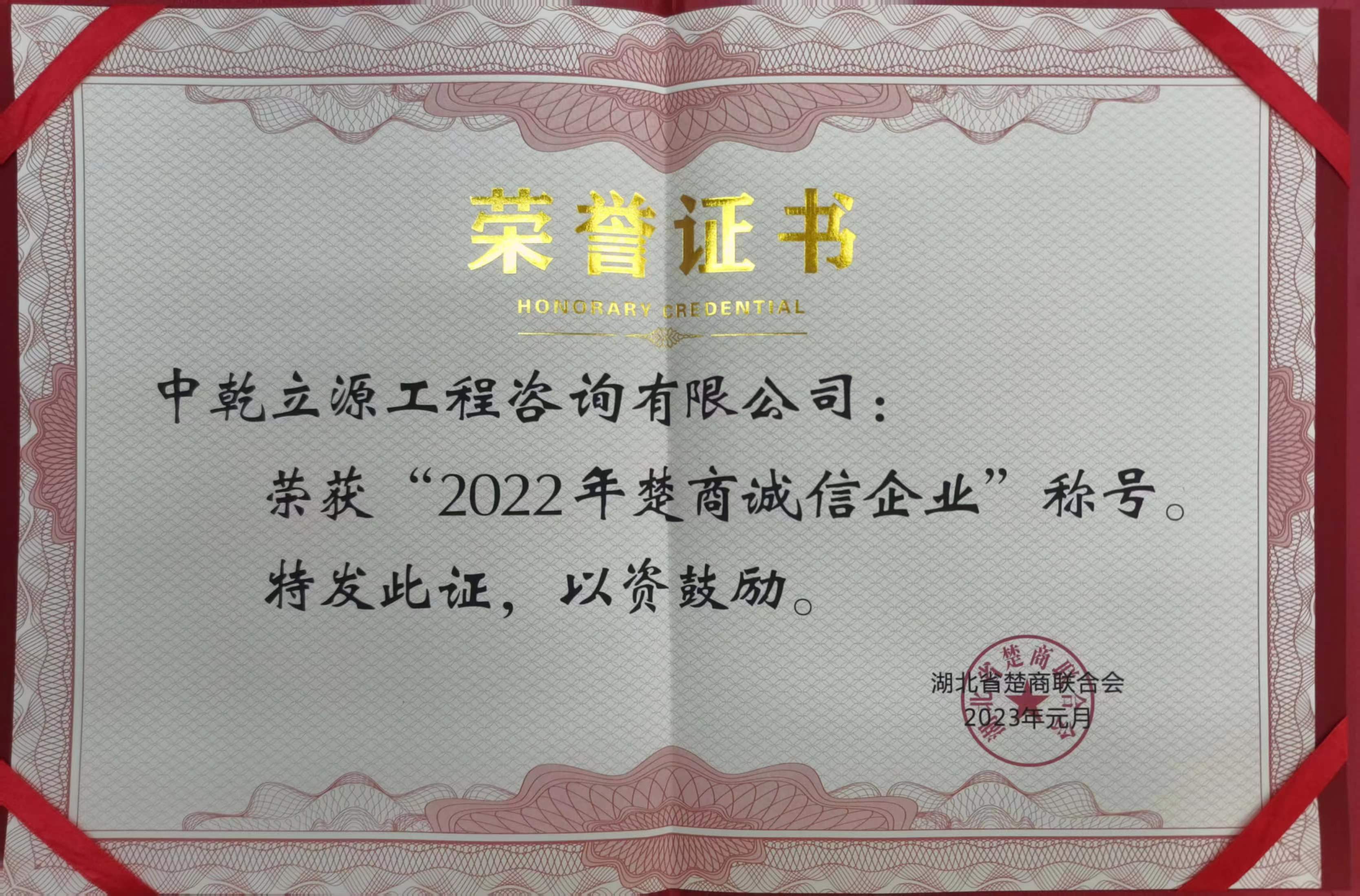 中乾立源榮獲由湖北省楚商聯(lián)合會(huì)組織評(píng)選的“2022年楚商誠(chéng)信企業(yè)”。
