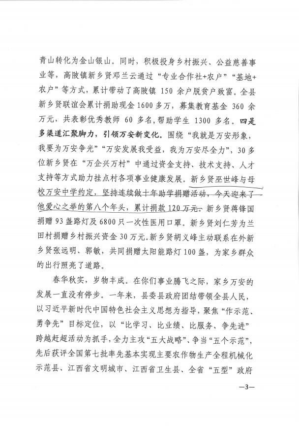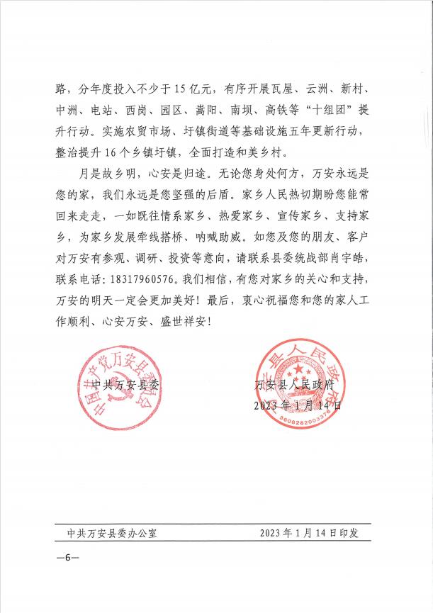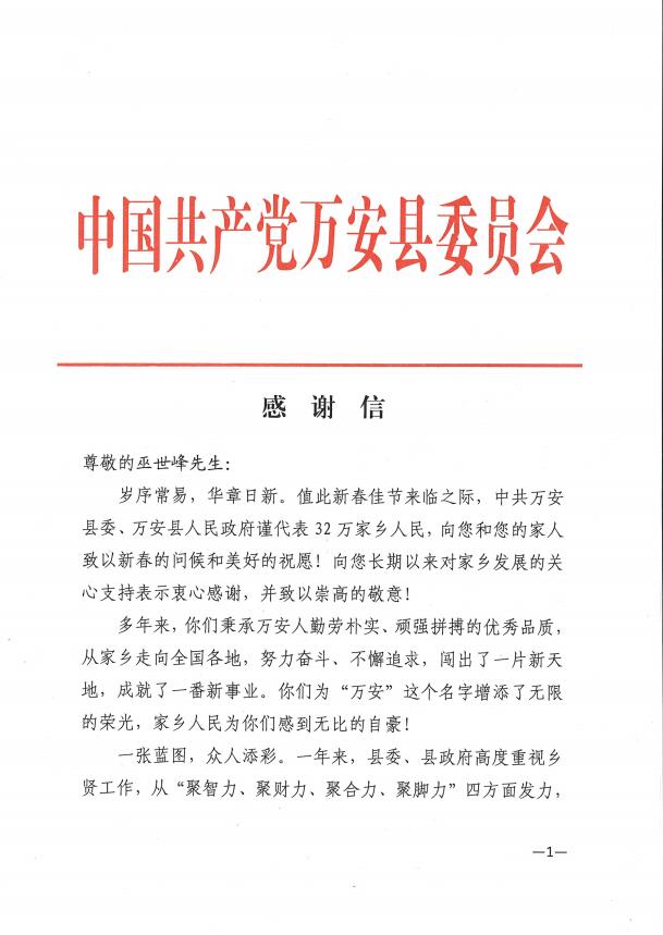 為了感謝鄉(xiāng)賢巫世峰對(duì)家鄉(xiāng)的關(guān)心與支持,萬安縣人民政府在新春佳節(jié)來臨之際特發(fā)來感謝慰問信。董事長(zhǎng)巫世峰始終有一顆回報(bào)桑梓的赤子情懷、感恩之心!一直以來高度關(guān)心關(guān)注家鄉(xiāng)各項(xiàng)事業(yè)發(fā)展,曾多次為支援家鄉(xiāng)建設(shè)捐款、捐物。他表示,將持續(xù)關(guān)注萬安縣鄉(xiāng)村振興工作,以實(shí)際行動(dòng)踐行企業(yè)的社會(huì)責(zé)任和擔(dān)當(dāng),為鄉(xiāng)村振興奉獻(xiàn)民營(yíng)企業(yè)力量。