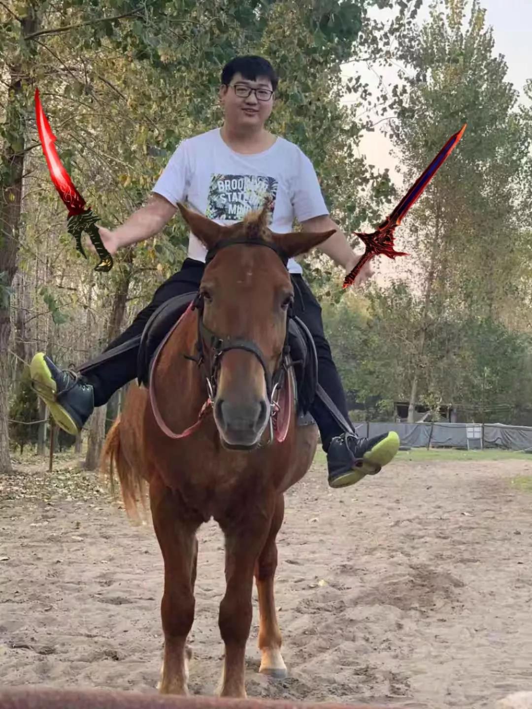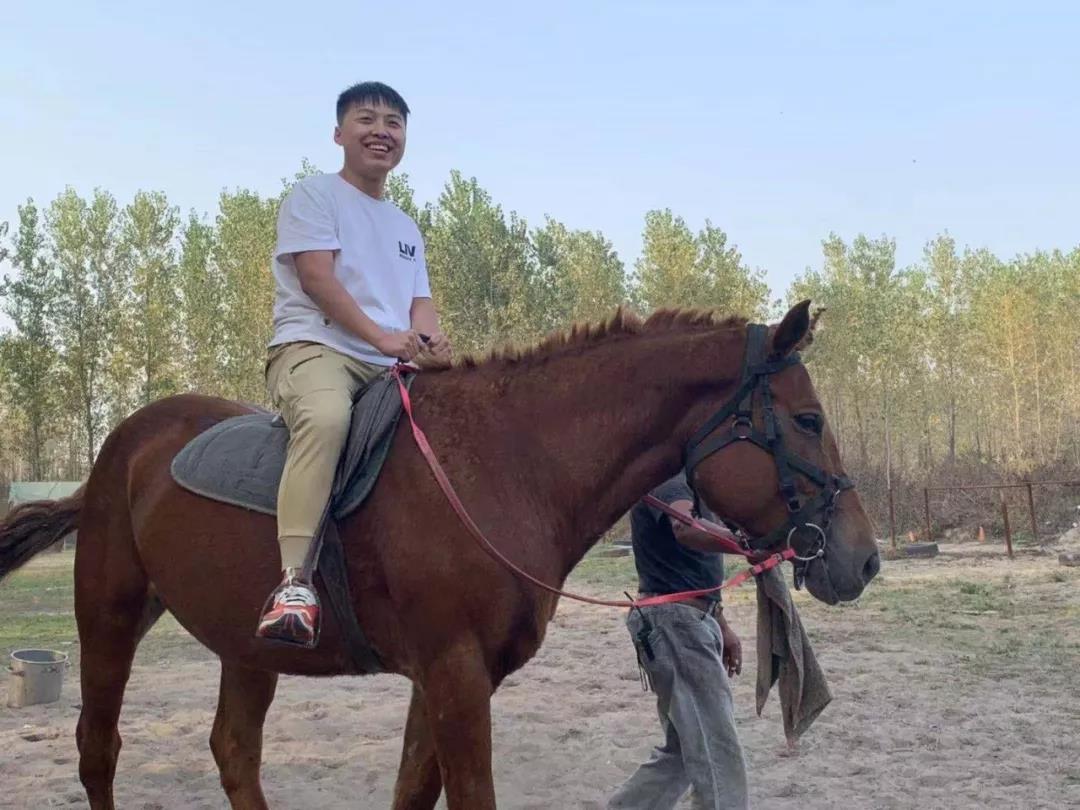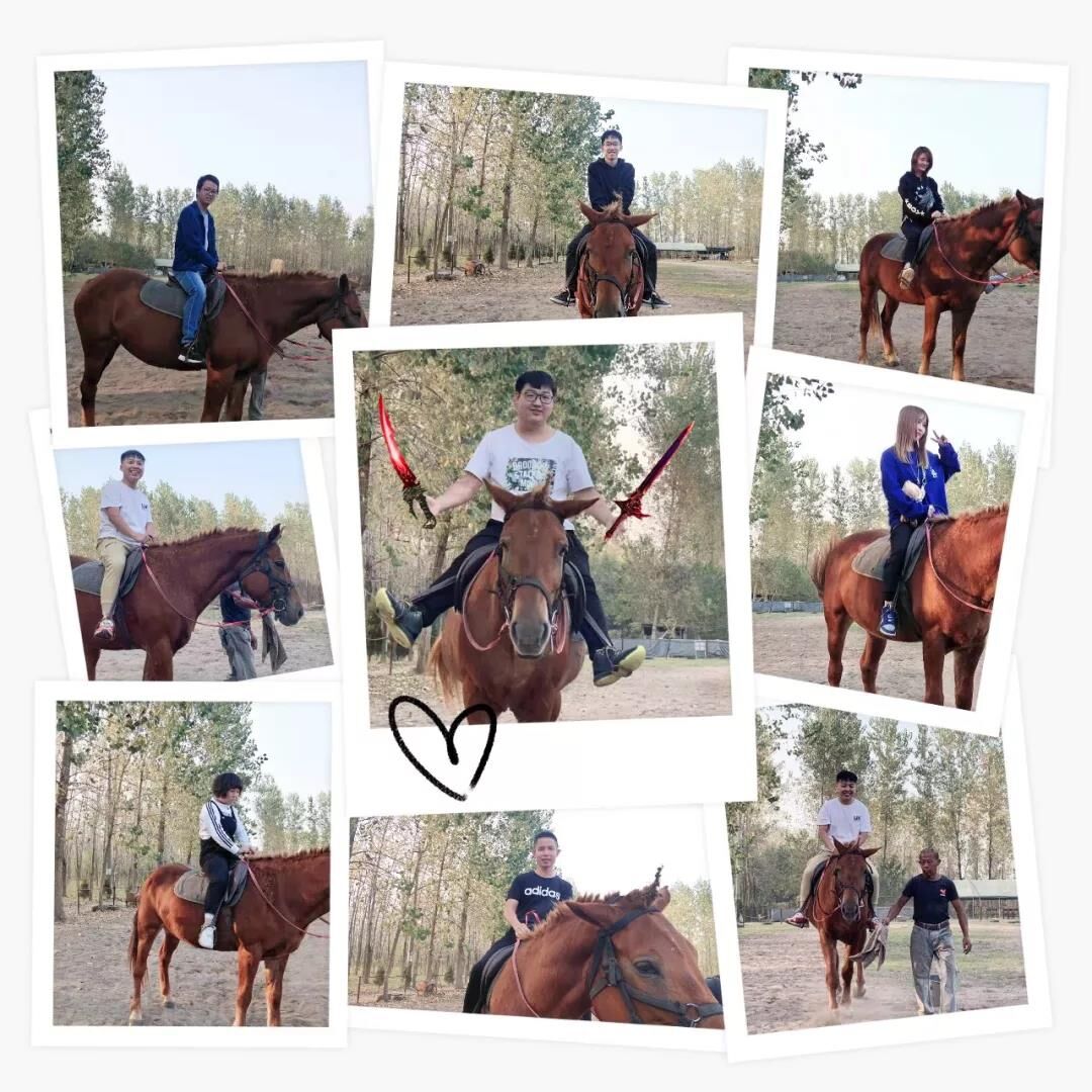 同事們身騎駿馬,一路馳騁,策馬奔騰。藍(lán)天白云,晴空萬(wàn)里,一群年輕人,朝氣蓬勃。