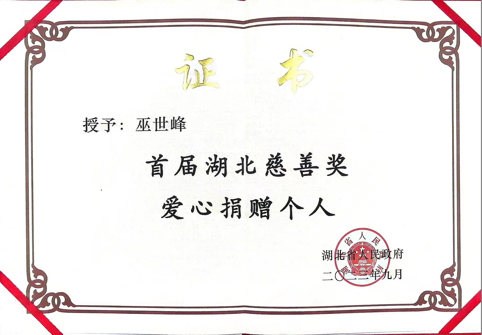 作為首屆湖北慈善獎“愛心捐贈個人”獲得者之一,巫世峰從最初參加工作的時候就開始了慈善幫扶之路,每當(dāng)手中超過一萬元,他就會拿出來資助他人,如今已經(jīng)堅持了近 20 年,2018年至2022年近五年時間,個人捐贈及組織捐贈多達(dá)668.67萬元,在扶貧、賑災(zāi)、助學(xué)、助老、城市建設(shè)等方面發(fā)揮積極作用,獲得過多項(xiàng)全國、省市區(qū)級公益慈善證書。