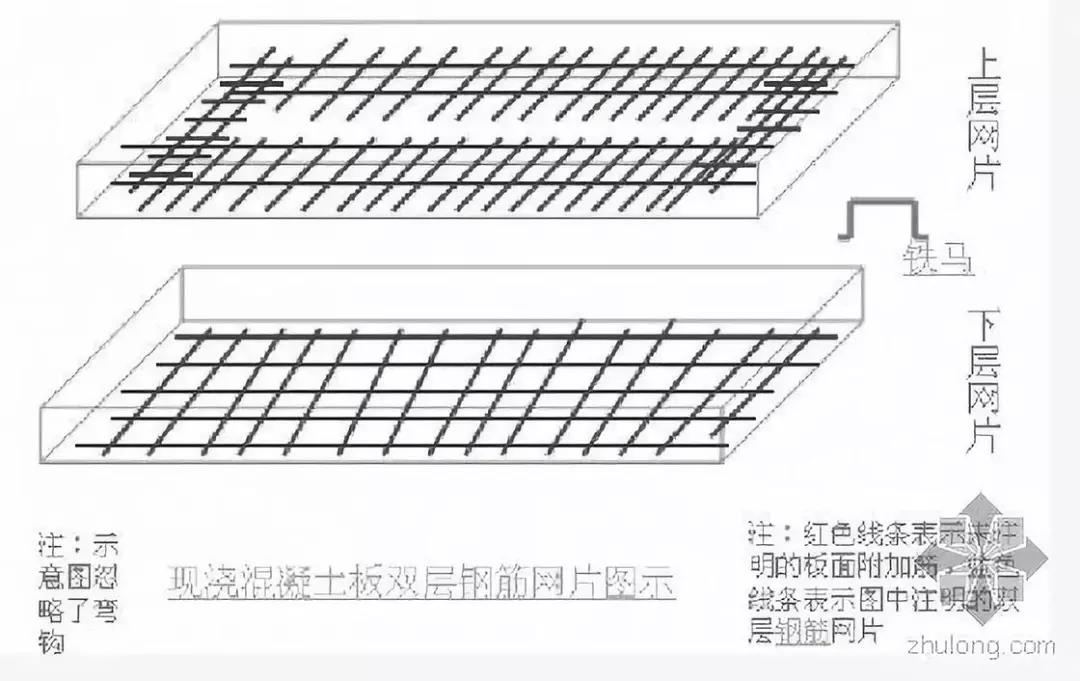 在計算鋼筋用量時,還要注意設計圖紙未畫出以及未明確表示的鋼筋,如樓板中雙層鋼筋的上部負彎矩鋼筋的附加分布筋、滿堂基礎底板的雙層鋼筋在施工時支撐所用的馬凳及鋼筋砼墻施工時所用的拉筋等。這些都應按規(guī)范要求計算,并入其鋼筋用量中。