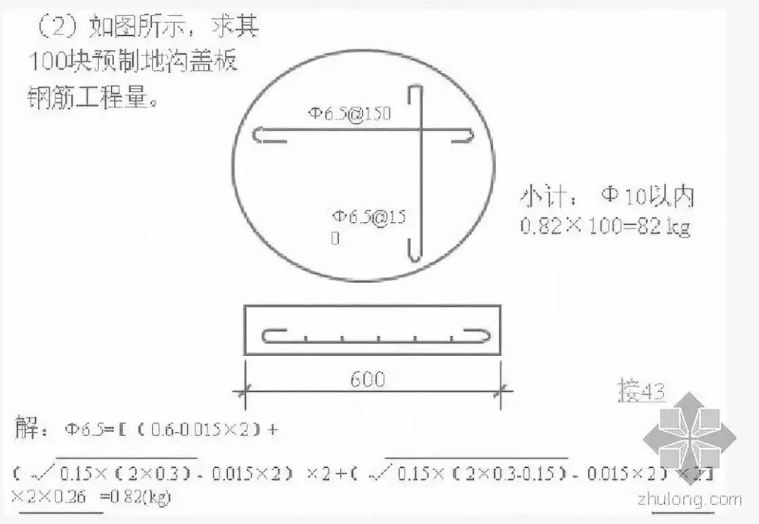 鋼筋工程量=鋼筋分規(guī)格長×Kg / m×件數(shù)(0.00617d2=Kg/m,鋼筋直徑:d—mm)