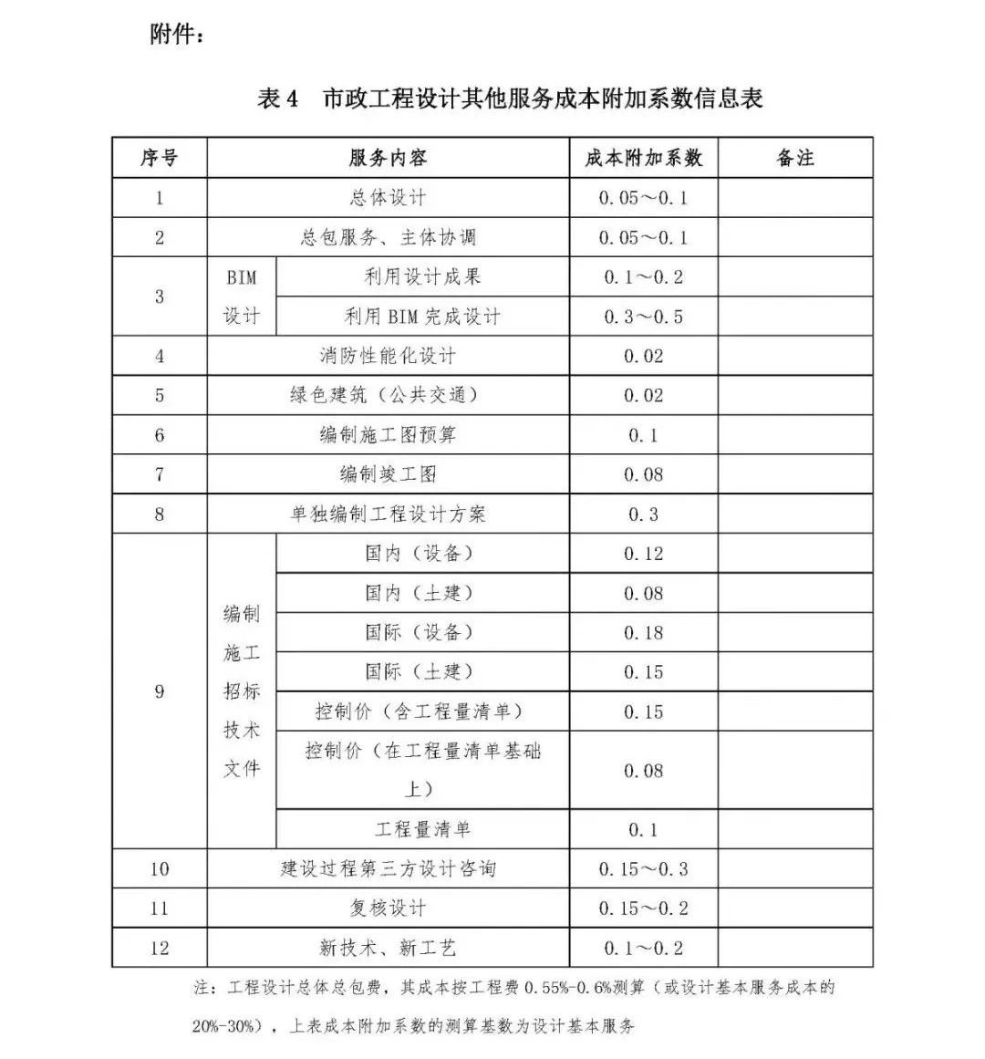 表4.市政工程設計其他服務成本附加系數(shù)信息表