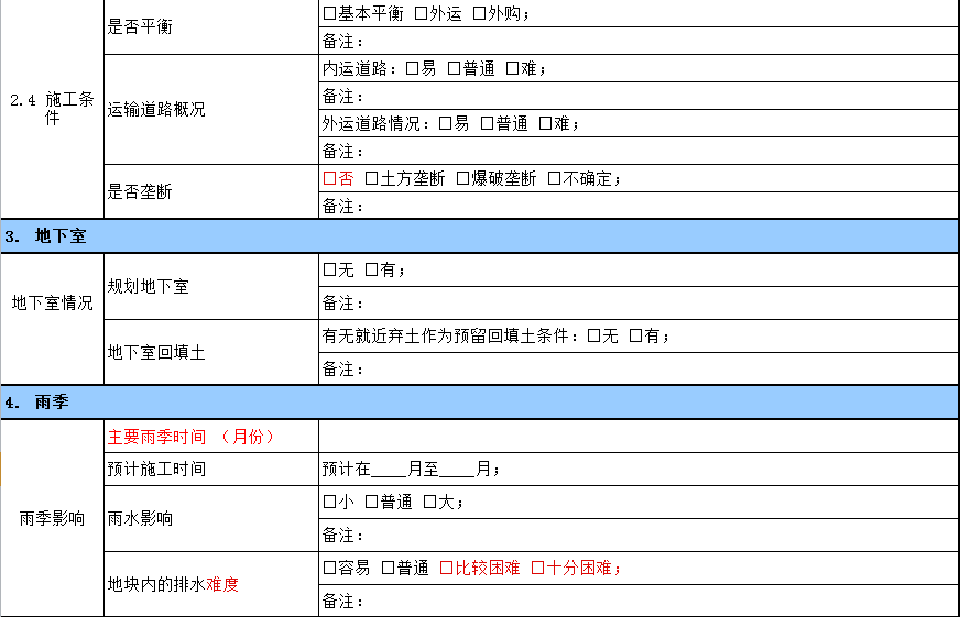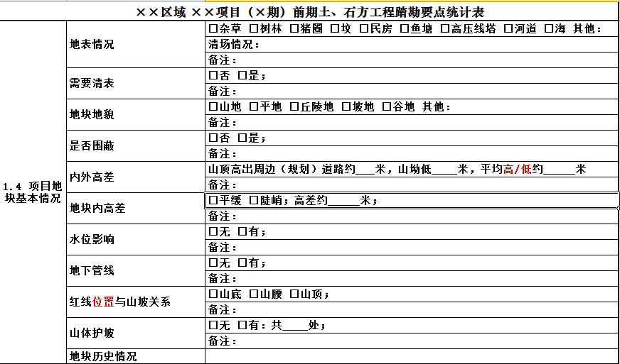 由于土地市場(chǎng)的狂熱,為了能夠讓投資拓展小組人員能夠快速而準(zhǔn)確的對(duì)土石方工程完成踏勘,應(yīng)針對(duì)此項(xiàng)工程制作專門的“土方踏勘清單”。