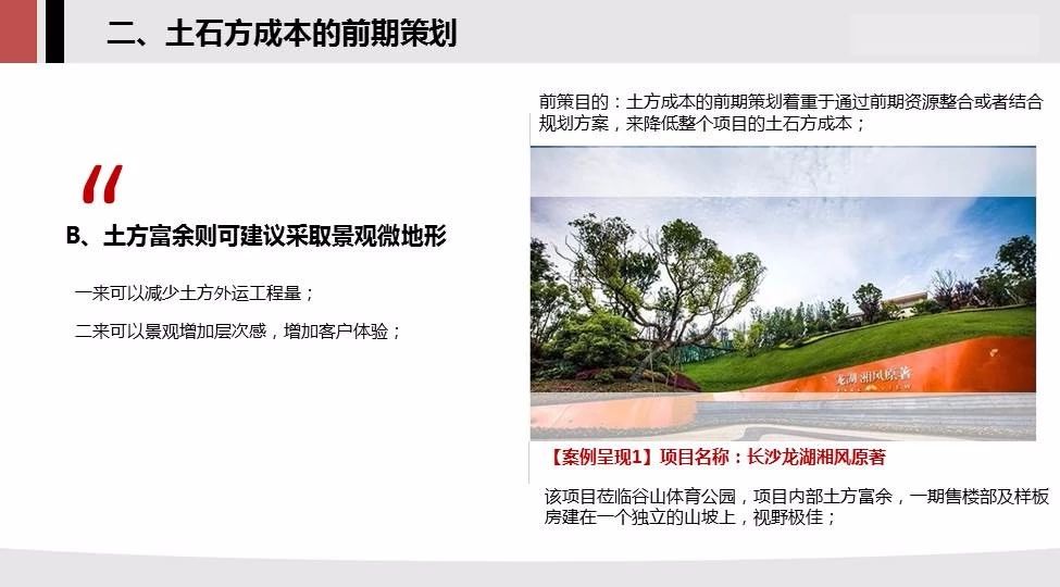 2.土石方的前期策劃:調(diào)研土方稀缺情況相反的項(xiàng)目,土方富余可建議采用微地形,節(jié)地模式可大大節(jié)約土方成本,山體地塊可做成坡地別墅;
