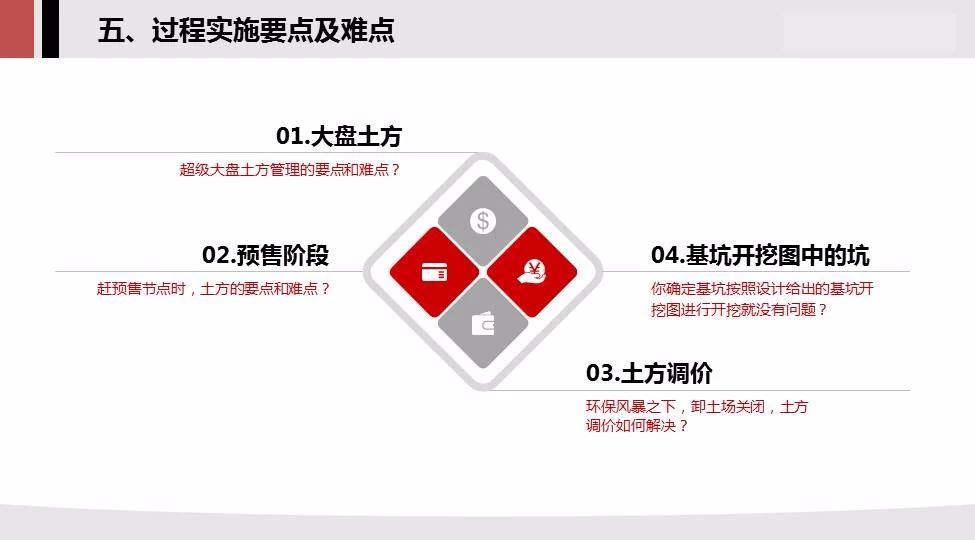 5.過程實(shí)施要點(diǎn)難點(diǎn):大盤土方,預(yù)售階段,土方調(diào)價(jià),基坑開挖圖中的坑一一說明;
