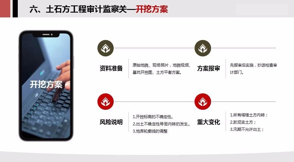 6.土石方監(jiān)察審計(jì)關(guān):測(cè)繪方式,原始地貌,開挖方案,闡述了三個(gè)方面的注意事項(xiàng)