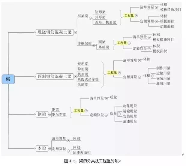 常見的梁按材質(zhì)分可分為現(xiàn)澆鋼筋混凝土梁、預(yù)制鋼筋混凝土梁、鋼梁三種,其工程量列項分為清單算量和定額算量兩種,見圖4.3