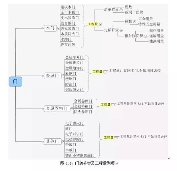 門按材質(zhì)類別不同可劃分為木門、金屬門、金屬卷簾門及其它門,其工程量列項分為清單算量和定額算量兩種,見圖4.4