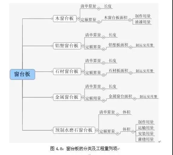 常見的窗臺板有木窗臺板、鋁塑窗臺板、石材窗臺板、金屬窗臺板、預(yù)制水磨石窗臺板等,其工程量列項見圖4.8