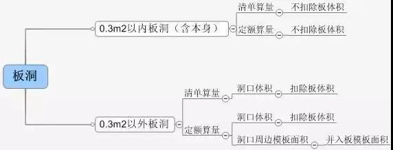 這里的板洞指的是頂板上開洞,分為0.3㎡以內(nèi)和以外兩種情況,其工程量列項見圖4.14