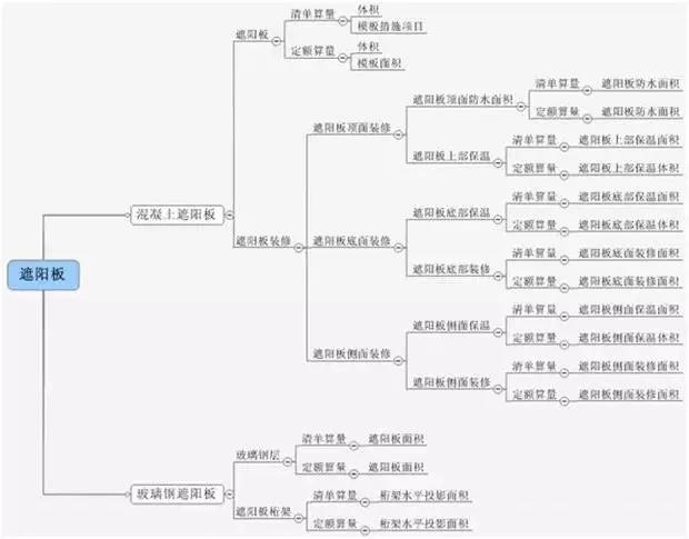 常見的遮陽板有混泥土遮陽板和玻璃鋼遮陽板,混凝土遮陽板的裝修往往伴隨著保溫一起出現(xiàn),其工程量列項見圖4.37