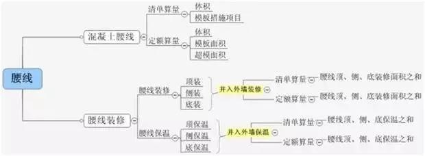 腰線一般為突出墻面的混凝土腰線,裝修往往伴隨著保溫一起出現(xiàn),其工程量列項見圖4.38
