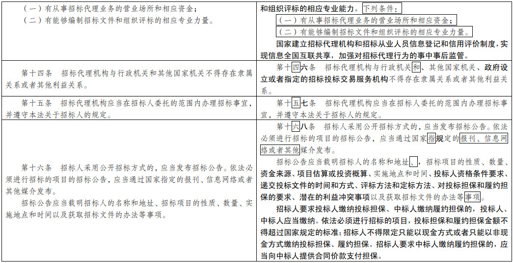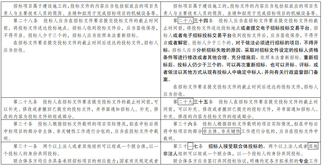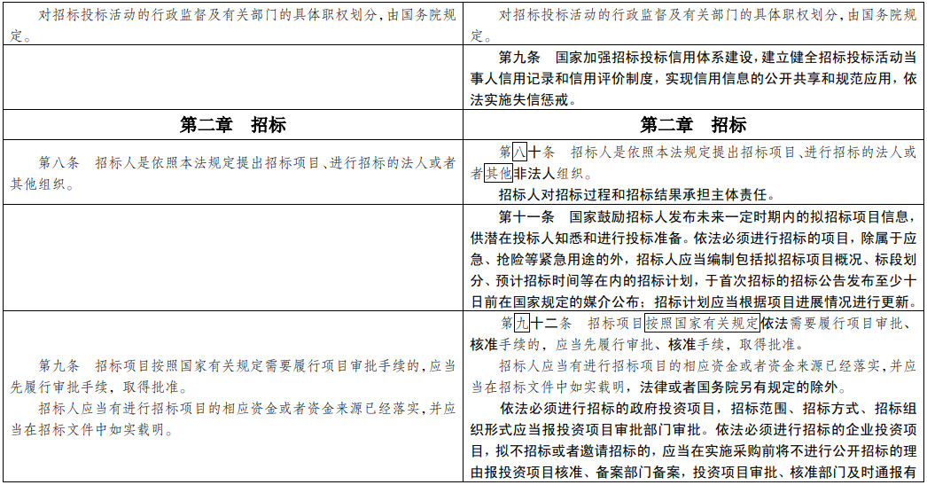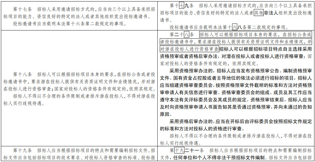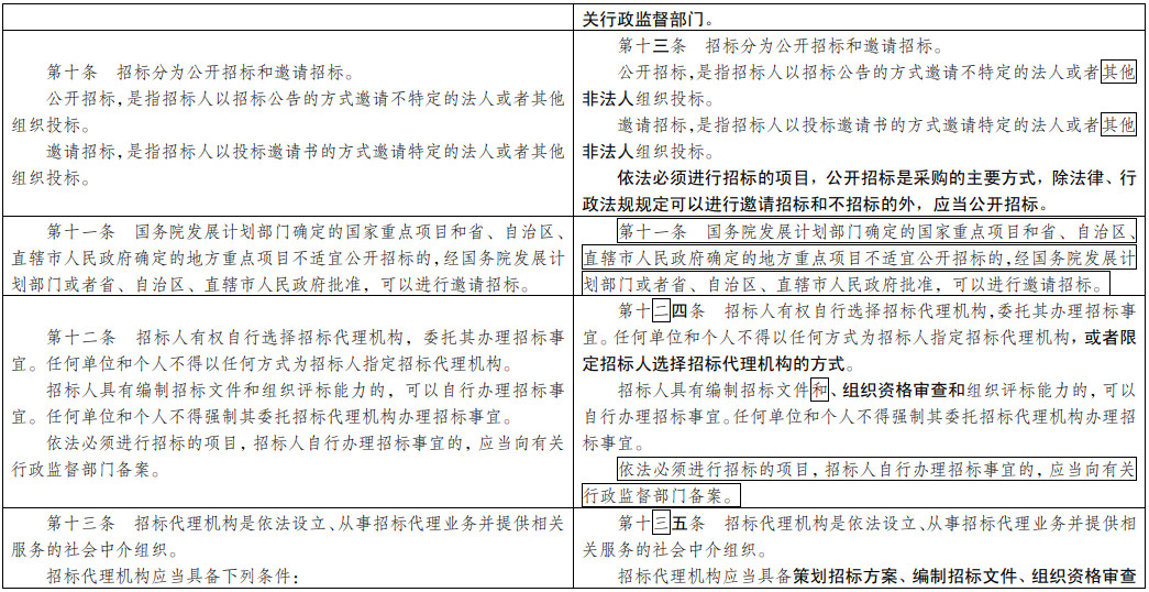 (七)為招投標(biāo)實(shí)踐發(fā)展提供法治保障。明確總承包招標(biāo)、集中招標(biāo)、兩階段招標(biāo)等招標(biāo)組織形式的法律地位。積極促進(jìn)電子招投標(biāo)推廣應(yīng)用。明確政府和社會(huì)資本合作項(xiàng)目遴選社會(huì)資本方有關(guān)招標(biāo)要求。擴(kuò)大了允許自然人投標(biāo)的項(xiàng)目范圍。