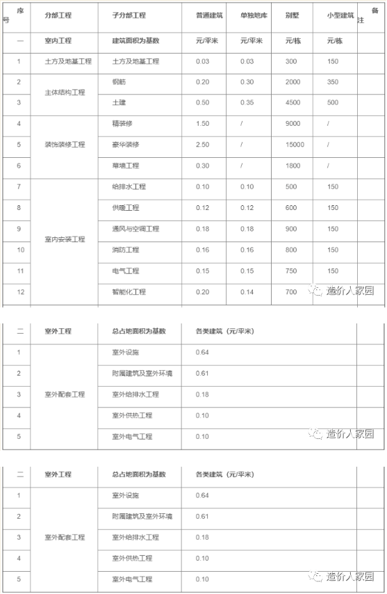 3、各種建筑類型的室外工程以項(xiàng)目總占地面積為計(jì)費(fèi)基數(shù)。