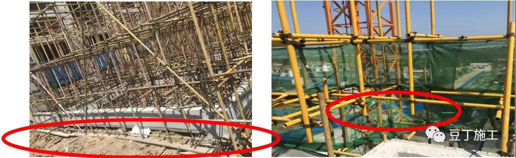 模架體系缺少一個方向或兩個方向頂部小橫桿,導(dǎo)致自由端超高;個別項目模架立桿部分懸空。