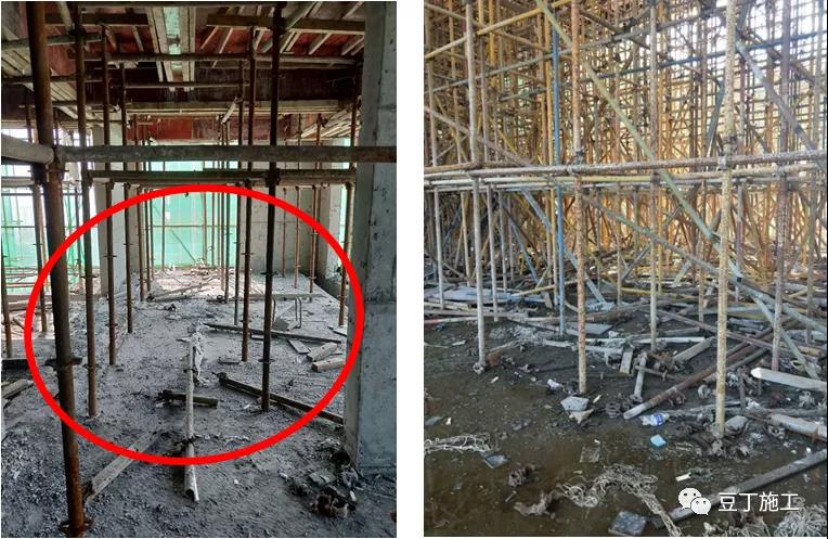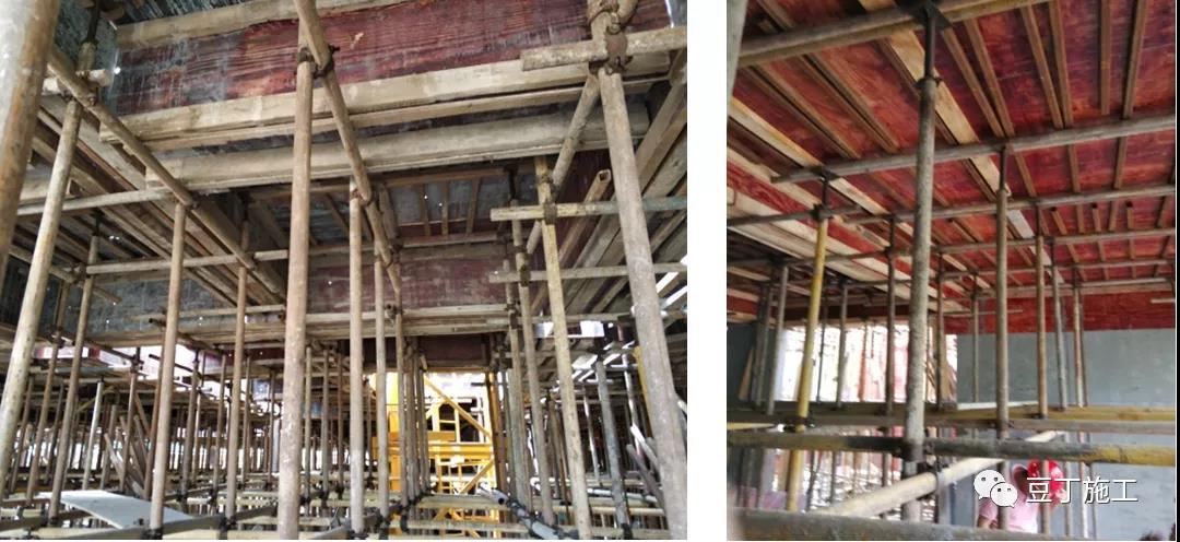 高大模板涉及地庫梁底模架立桿數(shù)量少、自由端高、無橫桿和板模架頂部支設(shè)隨意。