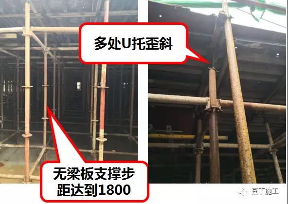 板底模架搭設(shè)不規(guī)范,架體缺失水平桿,步距過大,U托自由端長度超標(biāo)、U托歪斜。