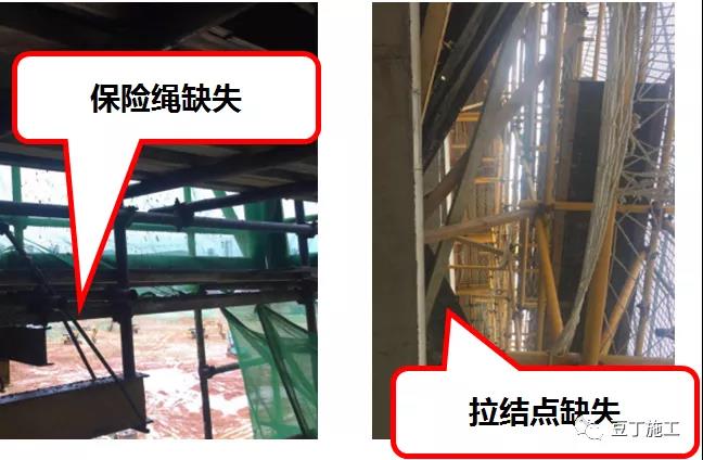 鋼絲繩使用不規(guī)范:采用卸扣和拉環(huán)拉結(jié)、共用拉環(huán)、用一根繩對折使用、與結(jié)構(gòu)摩擦無隔離。