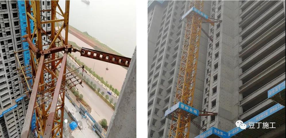 現(xiàn)場塔吊附臂形式混亂,如方案及交底中顯示塔吊為角鋼格構(gòu)式,方案驗收圖片為槽鋼格構(gòu)式,安全部驗收資料顯示符合方案要求;現(xiàn)場甚至出現(xiàn)同一層三肢附臂分別為角鋼格構(gòu)、槽鋼格構(gòu)、槽鋼對扣(或方管)的情況。
